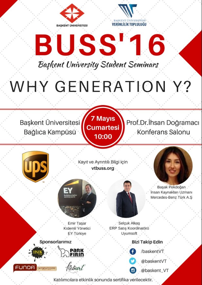 Başkent Üniversitesi Mühendislik Fakültesi Verimlilik Topluluğu tarafından düzenlenen BUSS 2016’da “Y kuşağı” teması ele alındı. Her sene kariyer yolculuğunun farklı bir durağında soluklanmayı hedefleyen Başkent University Student Seminars BUSS 2016’da iş dünyasında 1980 ve 2000 yılı itibariyle doğmuş olanları kapsayan “Y kuşağının” önemine dikkat çekildi. Günümüz iş yaşamında önemli bir yere sahip olan Y kuşağının tüm yönlerinin ele alınmaya çalışıldığı BUSS 2016’ya ilgi büyüktü. Mühendislik Fakültesi Dekanı Prof. Dr. Berna Dengiz açılış konuşmasında Y kuşağının özelliklerini anlatarak “Başkent Üniversitesi olarak gücümüzü mezunlarımızdan alıyoruz” dedi. Başkent Üniversitesi Rektörü Prof. Dr. Ali Haberal da yaptığı konuşmada Başkent Üniversitesi’nin Ankara’nın Kazan ilçesinde kuracağı bilim kentine ilişkin çalışmaların sürdüğünü belirterek, ülkenin geleceğinin, gençlerin çalışmalarına bağlı olduğunun altını çizdi. Başkent Üniversitesi’nin resmi olarak sanayi ile işbirliği içinde olduğunu vurgulayan Prof. Dr. Haberal, gençlere önemli tavsiyelerde bulundu. Mercedes- Benz Türk A.Ş. firmasında “Industrialization Project Coordinator” olarak görev yapan Başak Pekdoğan, Uyumsoft A.Ş. ERP Satış Koordinatörü Selçuk Alkaş, E&Y Türkiye (Ernst &Young) Kıdemli Yönetici Emir Taşar ve Bilişim Ltd. Şirketi ERP Çözümleri Müdürü Sedat Yılmaz gün boyu süren seminerlerde katılımcılara; Y kuşağının iş hayatında nasıl yer aldığı, Y kuşağı olmanın kolaylıkları ve zorlukları gibi birçok başlıkla Y kuşağı hakkında katılımcıları bilgilendirdiler.