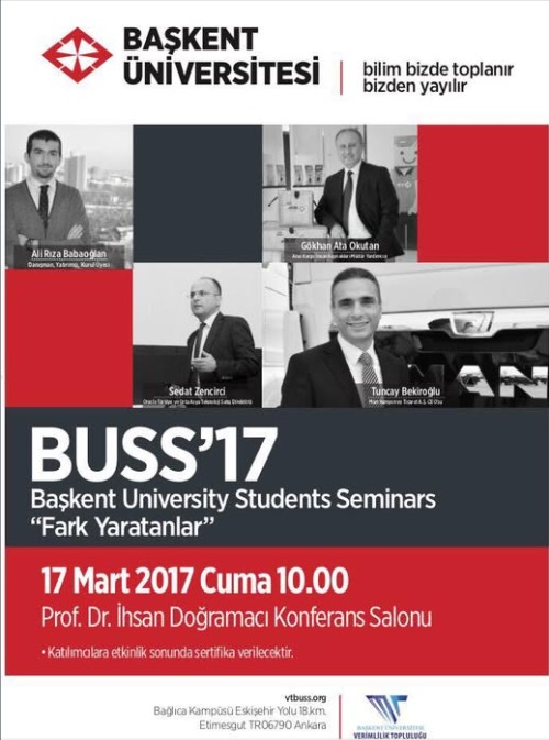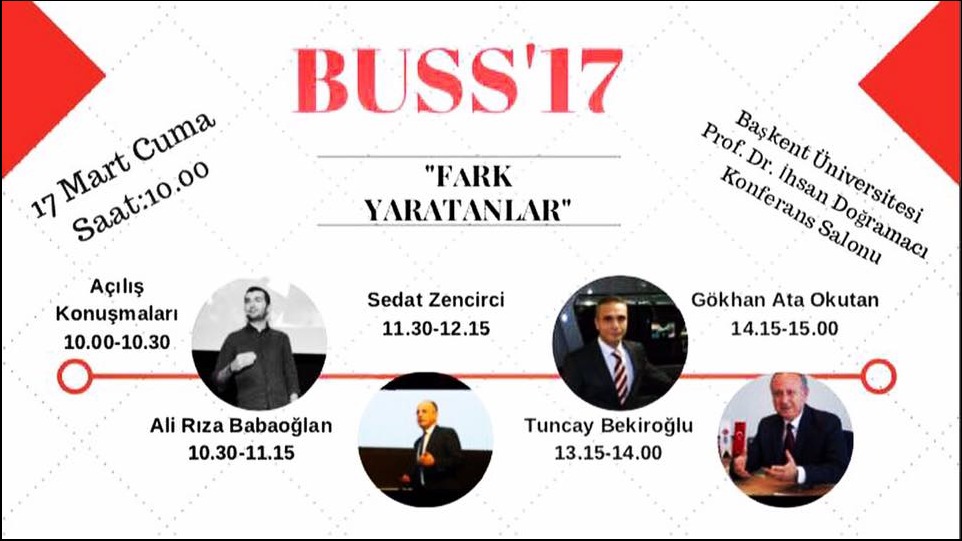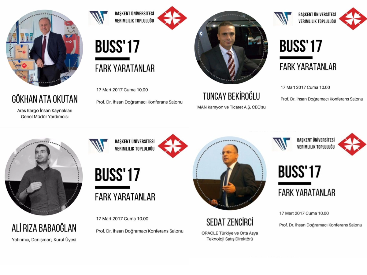 Başkent Üniversitesi Endüstri Mühendisliği bölümü Verimlilik Topluluğu tarafından, bu yıl ikincisi gerçekleştirilen Başkent Üniversitesi Öğrenci Semineri (BUSS), öğrenciyle iş dünyasını bir araya getiren iş dünyasında önde gelen kişilerin bir tema çerçevesinde deneyimlerini paylaştığı gönüllülük esasına dayalı olarak gerçekleştirilen bir öğrenci organizasyonudur. Geçen yıl ilki düzenlenen BUSS’16, 7 Mayıs 2016 tarihinde Başkent Üniversitesi Prof. Dr. İhsan Doğramacı Konferans Salonunda gerçekleştirilmiştir. Etkinliğin teması “Why Generation Y?” olarak belirlenmiş, Y Jenerasyonunun iş dünyasındaki yeri ve öneminden bahsedilmiştir. Bu yıl 17 Mart 2017 tarihinde gerçekleştirilen BUSS’17 “Fark Yaratanlar” temasıyla konuşmacıların kendi kariyer yolculuklarını, öğrencilik hayatlarında ve mezun olduktan sonra ne gibi yollardan geçtiklerini katılımcılarla paylaşmışlardır. BUSS’17 öğrenci seminerinin bu yılki konuşmacıları, Melek Yatırımcılık ve Girişim Fonlaması üzerine odaklanan ve aynı zamanda lisans eğitimini Başkent Üniversitesi Bilgisayar Mühendisliği bölümünde tamamlayan Ali Rıza Babaoğlan, MAN Kamyon ve Ticaret A.Ş. CEO’su Tuncay Bekiroğlu, Oracle Türkiye ve Orta Asya Teknoloji Satış Direktörü Sedat Zencirci ve Aras Kargo İnsan Kaynakları Genel Müdür Yardımcısı Gökhan Ata Okutan olmuştur. Katılımcılar alanlarında lider olan konuşmacıların deneyim ve bilgilerinden yaralanarak bir araya gelme fırsatı bulmuşlardır.